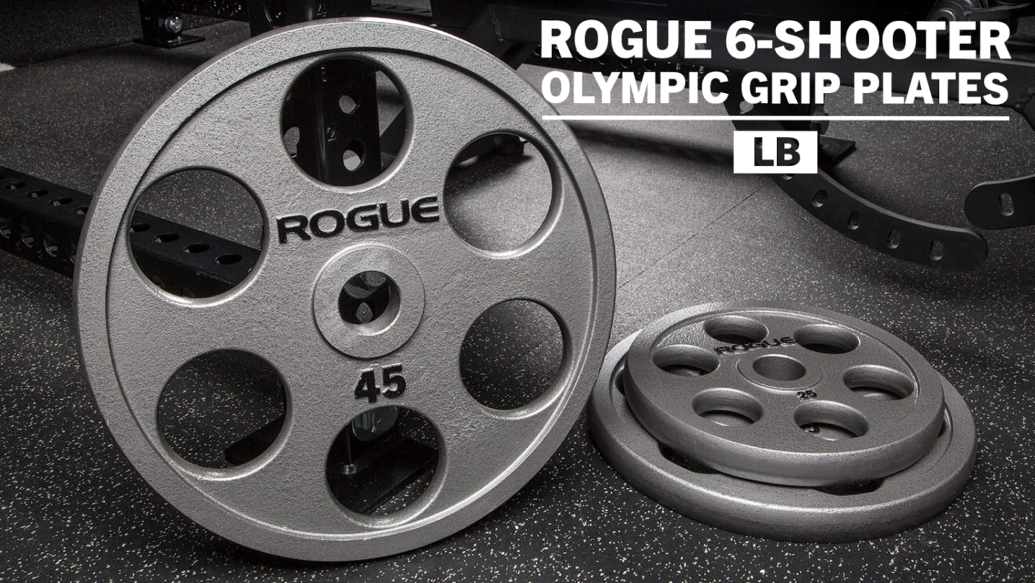 Each 6-Shooter Olympic Grip Plate includes LB markings, exclusive Rogue branding, and a 2โ diameter collar opening for compatibility on any standard Oly barbell. The smaller 6-Shooter change plates (2.5LB, 5LB, and 10LB) include a center hole only, without the additional six-hole pattern.