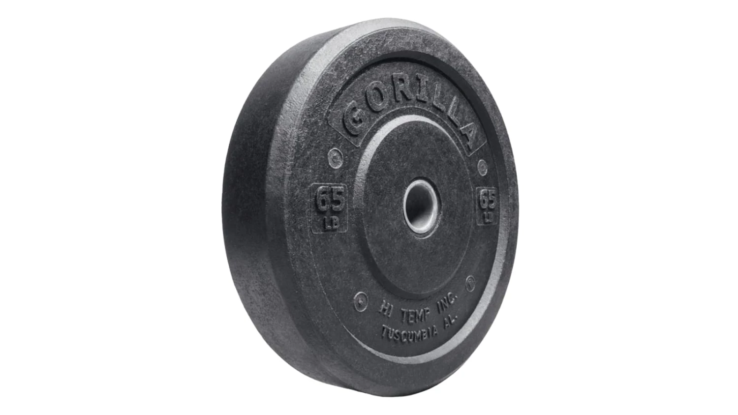 Rogue Gorilla bumpers are 65LB and just 4″ thick (compared to the standard 45LB plate at 3.75″). These have a slightly higher density than standard Rogue Hi-Temp bumpers that allows more weight in less space. A standard Olympic barbell can fit 4 Gorilla bumpers per side without collars which equals a total bar load of 565LB!