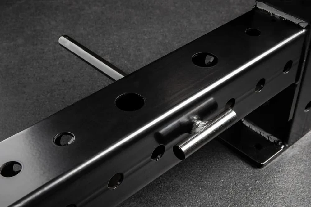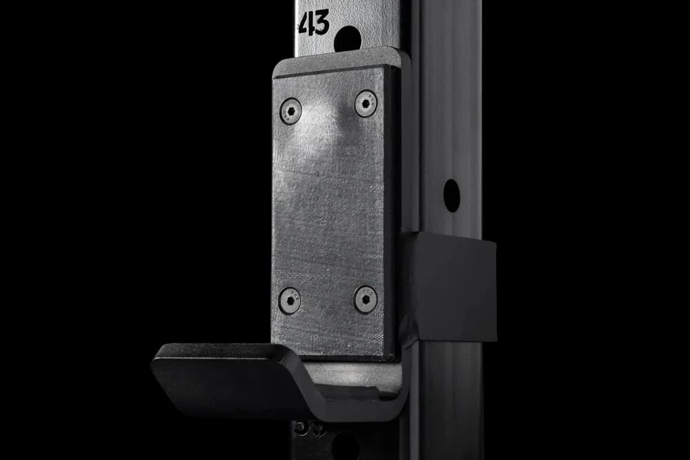 As with all past models, Version 3.0 of the RML-490C Rack is manufactured in Columbus, Ohio, and features 90โ tall uprights with laser-cut holes in the Westside pattern (1โ through bench and clean pull zone, 2โ spacing above and below). A full line-up of accessories also come standard with the 43โ depth unit, including a set of Monster Lite J-Cups, Pin/Pipe Safeties, Band Pegs, and a 43โ Single Pull-Up Bar. An optional stabilizer (in a matte black powdercoat finish) can be added to an order via the dropdown menu.