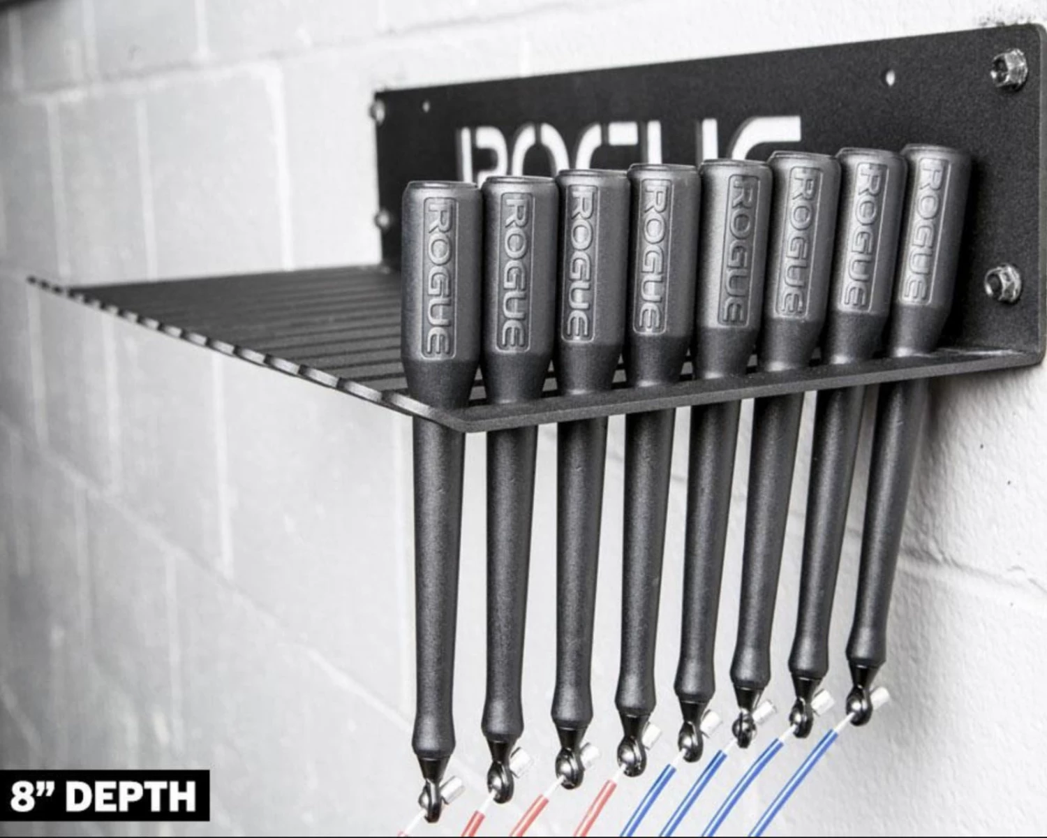 The 15 storage slots on the Jump Rope Hanger are designed and sized for compatibility with the handles of the Rogue SR and Fixed Length series speed ropes. The 5.125″ depth version can store up to 30 ropes (4 handles / 2 ropes per slot), while the 8.125″ depth hanger can hold up to 60 (8 handles / 4 ropes per slot). Users can also choose to hang the cord portion of any rope over the rungs for even greater storage capacity.
