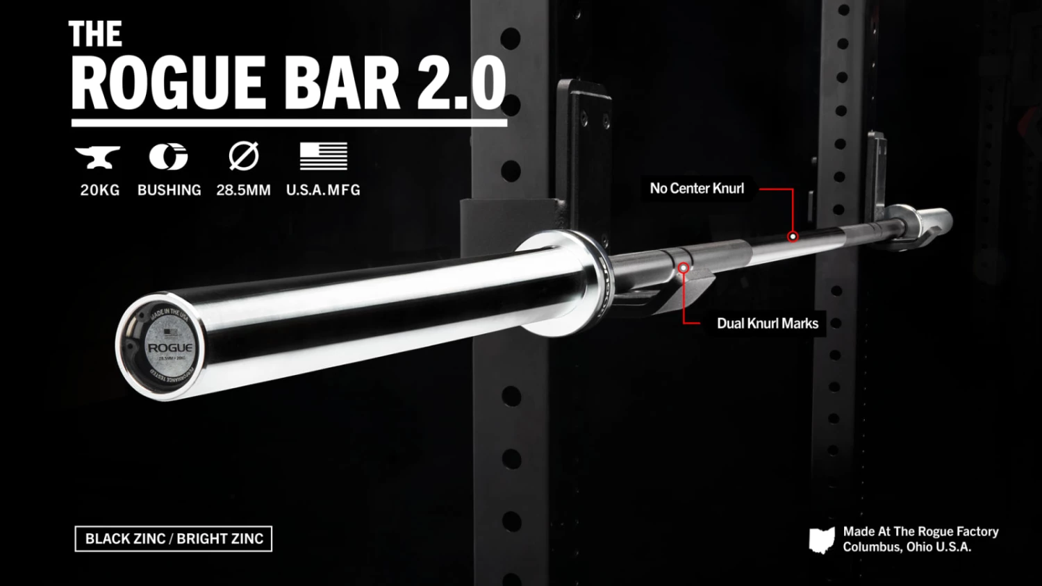 This is the next generation of the 28.5MM Olympic bar that helped launch the revolution. Now fully machined and assembled at the Rogue factory in Columbus, Ohio, the Rogue Bar 2.0 represents the highest level of precision engineering with a wide range of new featuresโincluding stronger 190 PSI steel, durable composite bushings, and CNC-machined groove sleeves with customizable color bands, available here.